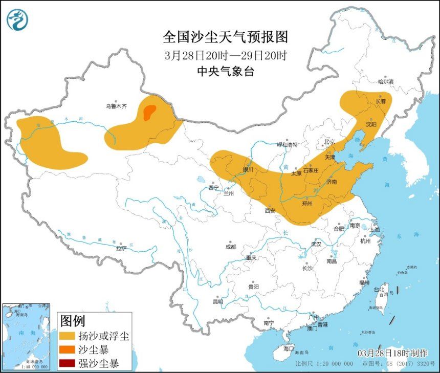 3月28日18时,中央气象台发布沙尘暴蓝色预警:预计,3月28日20时至29日20时,内蒙古东南部、辽宁中西部、吉林南部、天津、河北中南部、山西南部、河南、山东、苏皖北部、新疆南疆盆地和东部、甘肃北部、宁夏、陕西中北部等地有扬沙或浮尘天气,其中,新疆东部局地有沙尘暴。
