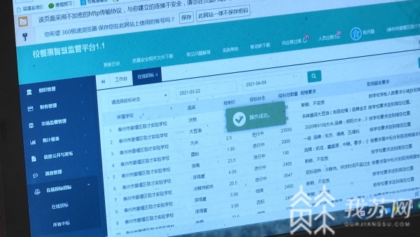食堂后厨的操作,实现了远程实时监管。2020年,姜堰区投入500万元,为全区学校食堂安装1000多个高清摄像头,验货、清洗、烹饪、分餐、餐厅等重点部位全覆盖,并与区教育局监控中心联网。上午十点半,许卫华打开电脑,通过校餐惠平台,随机查看学校食堂后厨工作情况,发现有工作人员没有戴口罩,他立即联系学校负责人,要求对方立即赶到现场处理。“一天我们基本上抽看两到三个食堂,如果发现问题,我们就立即通知学校,要求他立即整改。”