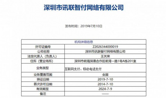 讯联智付于2014年7月获得央行颁发的第三方支付牌照,业务许可范围包括互联网支付、移动电话支付。