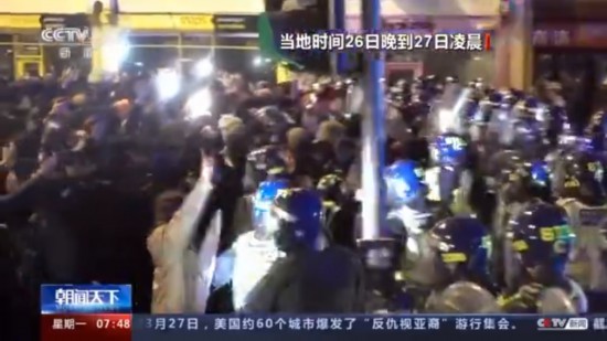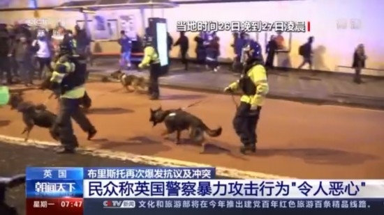当地时间26日晚到27日凌晨,在布里斯托市当地民众举行的示威游行中,抗议者和警察发生了激烈的冲突,警察出动大量警力、派出警犬驱赶抗议者,甚至有媒体人员遭到暴力冲击。此外,手持警盾的警察向抗议民众推进,并用警盾推搡甚至击打抗议者。据英国当地媒体的一名记者自称,他在表明记者身份后仍然遭到了警方的殴打。对于警方的行为,英国民众表示强烈抗议。