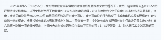行政处罚决定书指出,“2021年1月27日14时25分,被处罚单位在未取得城市建筑垃圾处置核准文件的情况下,使用一辆车牌号为浙B3B55Y的轻型特殊结构货车,从百丈路新世界工地装载约10立方米的建筑垃圾,在江东南路兴宁桥下向南100米被执法队员查处。
