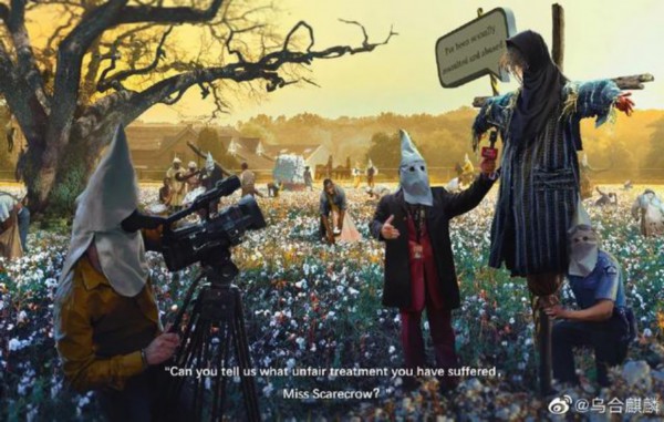 这幅题为——Blood Cotton Initiative (血腥棉花发展计划)的画里,描绘的了一群用白色尖帽蒙脸的记者和警察,在棉花地围着一个稻草人进行采访,而他们身后是正在辛苦采棉的黑奴们。