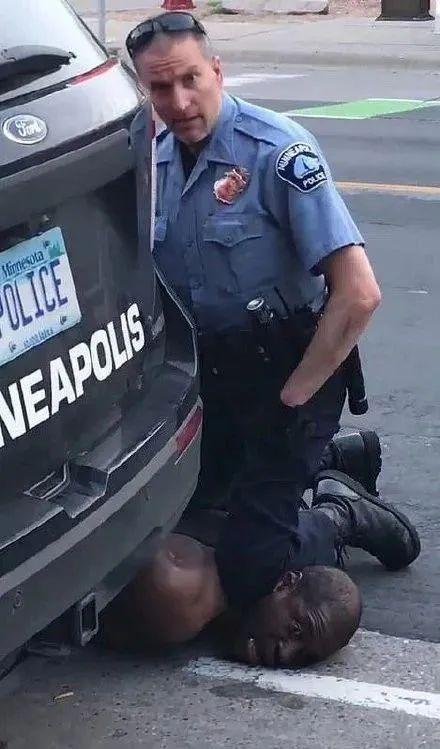 细节六:半跪的警察画面右下角半跪的警察,姿势神似跪压锁喉黑人弗洛伊德致死的美国警察。