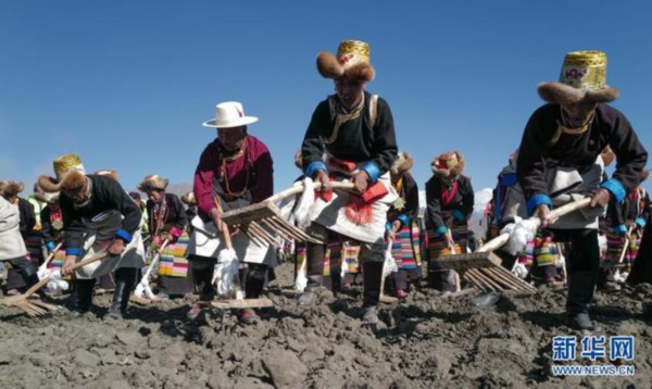 3月16日,西藏山南市乃东区克松社区居民在参加春耕仪式。新华社记者 孙瑞博 摄