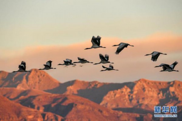 黑颈鹤在拉萨市林周县黑颈鹤自然保护区上空飞翔(2019年1月1日摄)。新华社记者 张汝锋 摄