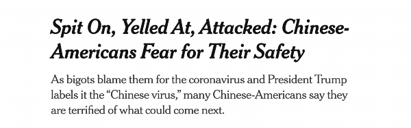 《纽约时报》在一篇报道中提到,当特朗普和他的共和党盟友拒绝世卫组织关于命名疾病时不应使用地理位置的指导,并偏执地将新冠病毒称为“中国病毒”时,许多华裔美国人表示他们对未来感到恐惧。