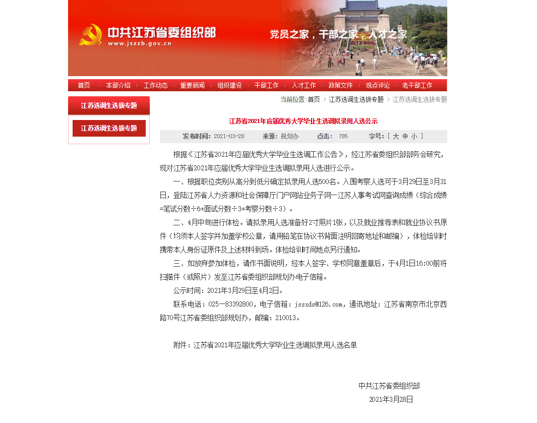 根据《江苏省2021年应届优秀大学毕业生选调工作公告》,经江苏省委组织部部务会研究,现对江苏省2021年应届优秀大学毕业生选调拟录用人选进行公示。