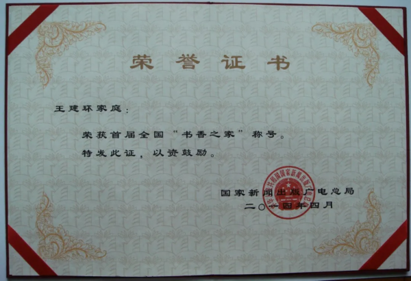 家人在他的带动下也养成读书习惯,平均每人每天阅读时间都超过3小时。2014年,王建环家庭获得首届全国“书香之家”称号。