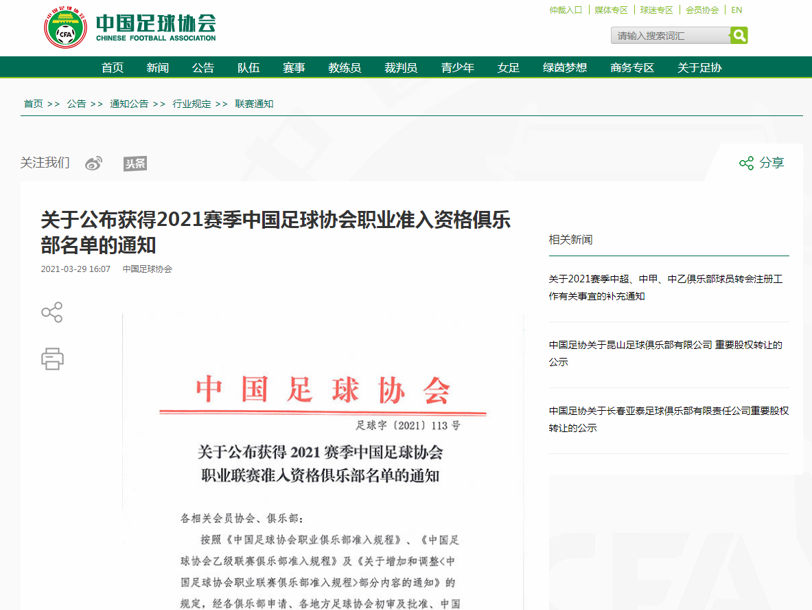 中国足球协会官网截图