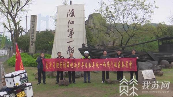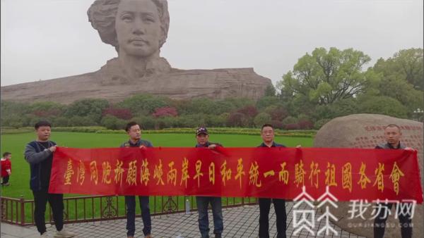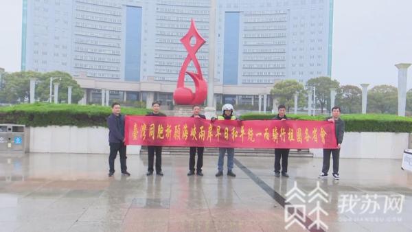 在江阴文明广场,陈文仁特别展示了他精心制作的横幅,并和友人在广场雕塑前合影留念。为祖国和平统一奔走祝福,这是他单骑环游中国的初衷所在。