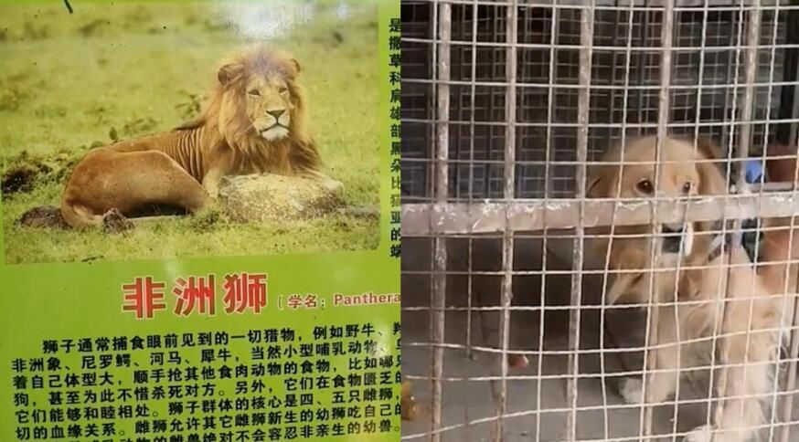 该工作人员称,之前笼子里一直都关有非洲狮,金毛狗关在另外一个笼子里,“金毛狗是园长自己养的,笼子空着的时候就关在这个地方。”该工作人员分析称,应该是游客先拍了非洲狮的宣传牌,再拍了笼子里的金毛狗,因此给大家造成误解。