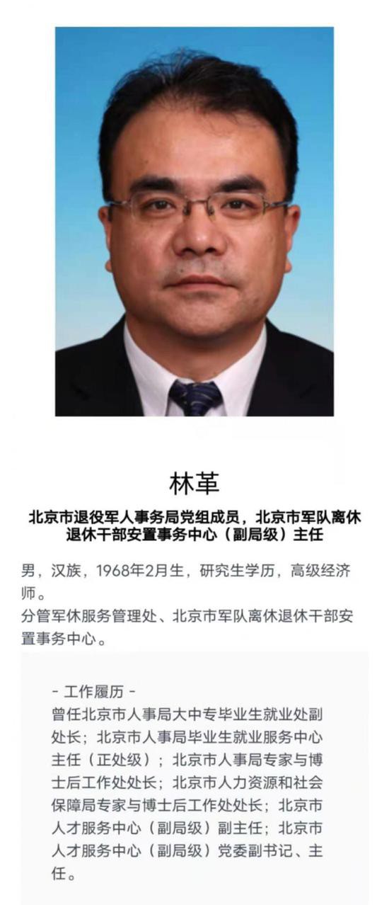 首都之窗更新信息显示,林革任北京市退役军人事务局党组成员,北京市军队离休退休干部安置事务中心(副局级)主任。