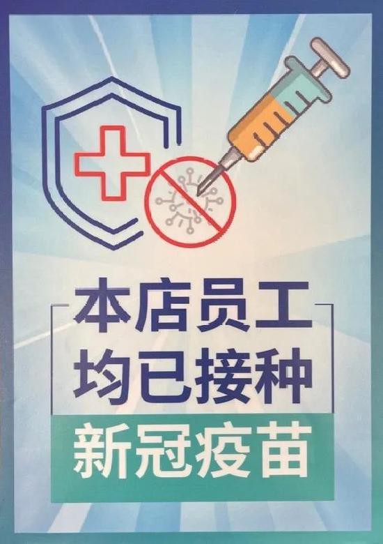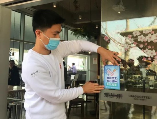 “乔咖啡”店长把“本店员工均已接种新冠疫苗”的蓝色标贴,贴在店铺橱窗的醒目位置“