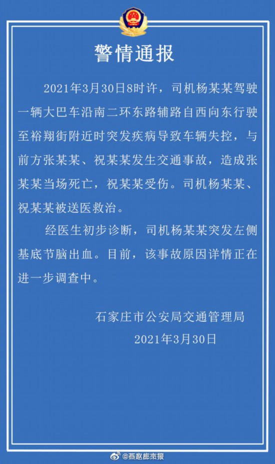2021年3月30日8时许,司机杨某某驾驶一辆大巴车沿南二环东路辅路自西向东行驶至裕翔街附近时突发疾病导致车辆失控,与前方张某某、祝某某发生交通事故,造成张某某当场死亡,祝某某受伤。司机杨某某、祝某某被送医救治。经医生初步诊断,司机杨某某突发左侧基底节脑出血。目前,该事故原因详情正在进一步调查中。
