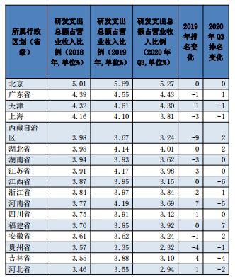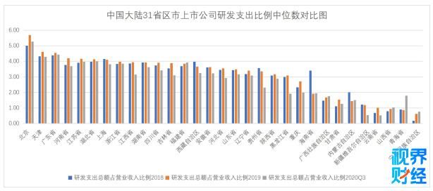 从中国大陆31省区市来看,2018年北京地区上市公司研发支出总额占营业收入比例的中位数是5.01%,是内地研发投入比例最高的地区,且这一优势在2019年、2020年前三季度持续保持。