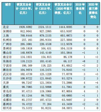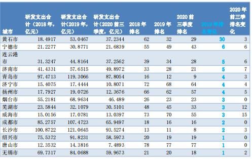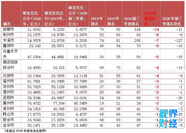 视界财经统计发现,2018年A股上市公司研发支出合计超过10亿元、2019年排名上升且2020年前三季排名未下降的城市共有19个,具体如下: