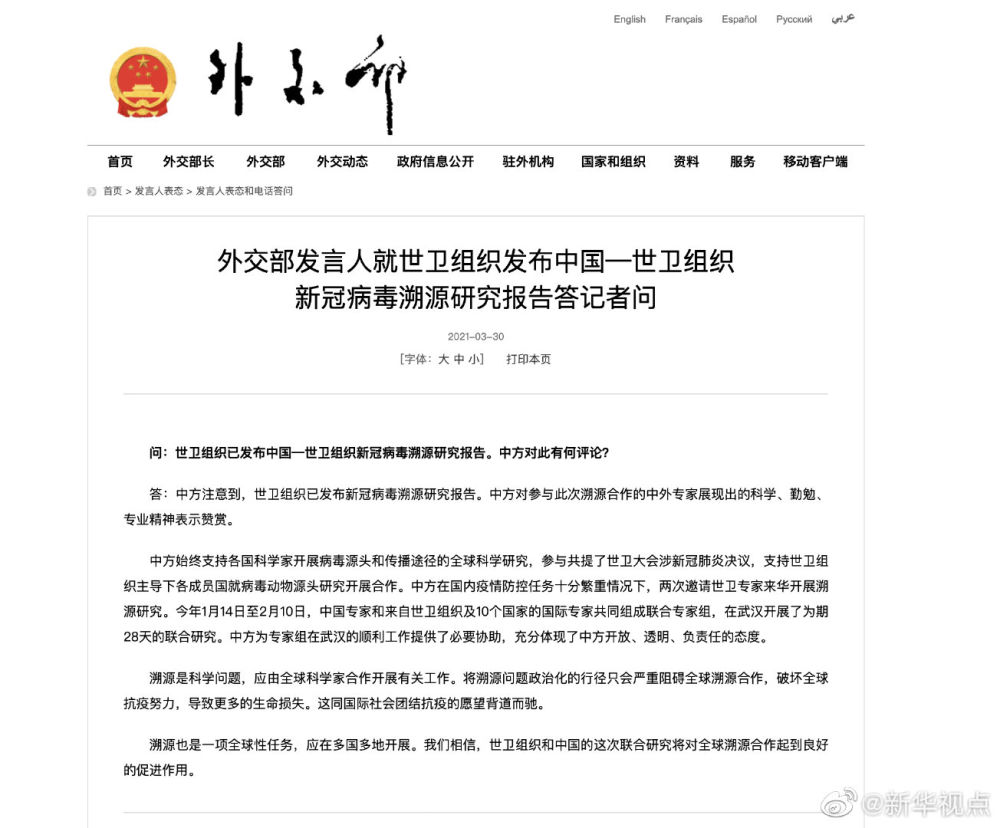 问:世卫组织已发布中国—世卫组织新冠病毒溯源研究报告。中方对此有何评论?