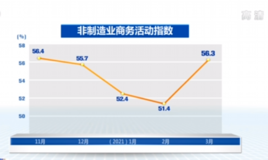 3月份非制造业商务活动指数为56.3%,高于上月4.9个百分点。分行业看,随着疫情防控成果巩固,消费需求不断释放,服务业加快恢复。