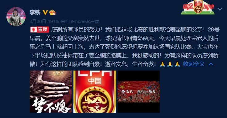 “感谢所有球员的努力!我们把这场比赛的胜利献给姜至鹏的父亲!28号早晨,姜至鹏的父亲突然去世,球员请假回青岛两天,今天早晨处理完老人的后事之后马上就赶回上海,表达了强烈的愿望想要参加这场国家队比赛。” “大宝也在下半场把队长袖标戴在了姜至鹏的胳膊上。我挺感动的!为有这样的队员感到骄傲!为有这样的团队感到自豪!”