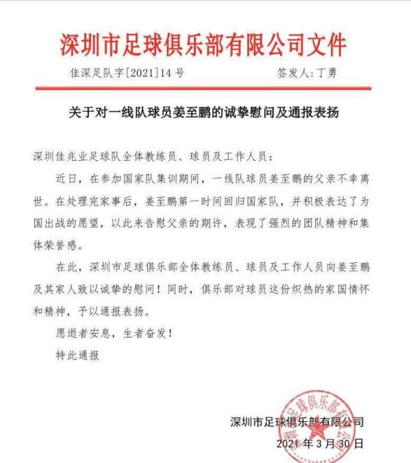 而得知此事后,姜至鹏效力的深圳足球俱乐部教练、队员和工作人员纷纷通过微信留言请他节哀。俱乐部也内部发文向姜至鹏及其家人表达深切慰问,同时褒奖了他舍家为国的奉献精神。