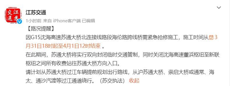 我苏网讯 据江苏交通官方微博消息,因G15沈海高速苏通大桥北连接线路段海伦路跨线桥需紧急抢修施工,施工时间从3月31日18时起至4月1日12时结束 。