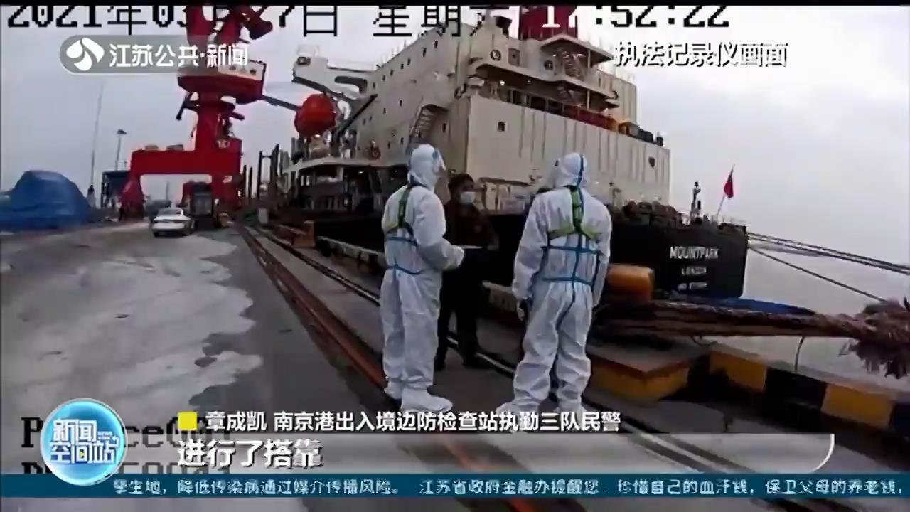 3月27日下午,在南京龙潭港区执勤的民警接到指挥中心指令,有一艘中国籍船舶正在搭靠外轮。民警立即穿戴好防疫装备,上船检查。