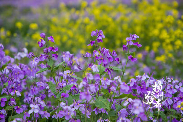 这片“紫黄花卷”由浪漫的二月兰和金黄的油菜花组成。春风拂过,两者交融掀起阵阵花浪,加上远处小山丘的映衬,营造出浓浓的田园风、山野风,吸引不少市民和游客拍照合影。记者在现场看到,二月兰和油菜花交织成的“紫黄画卷”里面竟然还有两座精巧玲珑的小矮屋,充满童趣的色彩,可爱迷你的造型,让人恍若一下子穿越到了霍比特人的小屋。