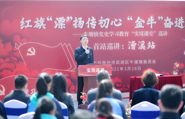 红旗“漂”扬传初心,“金牛”奋进启新程。日前,常州市武进区牛塘镇启动党史学习教育“实境课堂”巡讲活动,首站走进全镇第一个党支部诞生地漕溪村。全镇党员代表及优秀共青团员等百余人相聚海棠初心园,共同聆听党课,种下海棠树,上了一堂意义非凡的党史学习教育课。