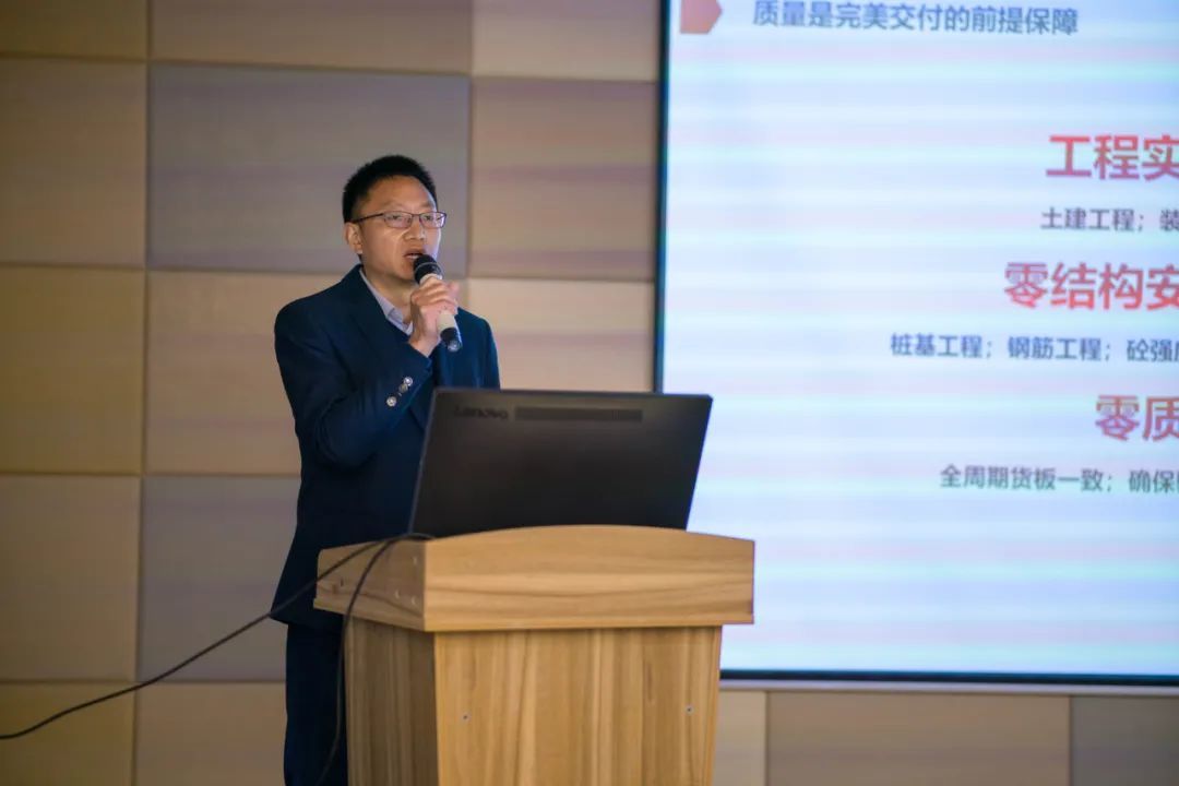 接下来,江苏区域运营管理部负责人吴珍华作《强基固本,匠心筑家》主题汇报,强调了将安全和质量永远排在第一位的理念,要求高度重视安全管理,狠抓质量管理痛点,做好完美交楼工作。