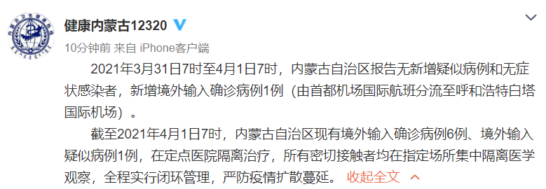荔枝新闻讯 据“健康内蒙古12320 ”官方微博消息,2021年3月31日7时至4月1日7时,内蒙古自治区报告无新增疑似病例和无症状感染者,新增境外输入确诊病例1例(由首都机场国际航班分流至呼和浩特白塔国际机场)。