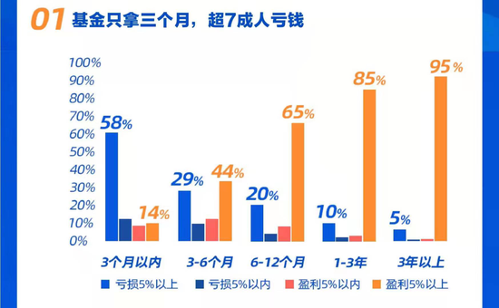 根据《一季度基民报告》显示,以支付宝金选近一百只产品为例,持有基金时长在3个月以内的用户,超7成都是亏损的,而持有基金时长超过一年的用户中,近9成是赚钱的。
