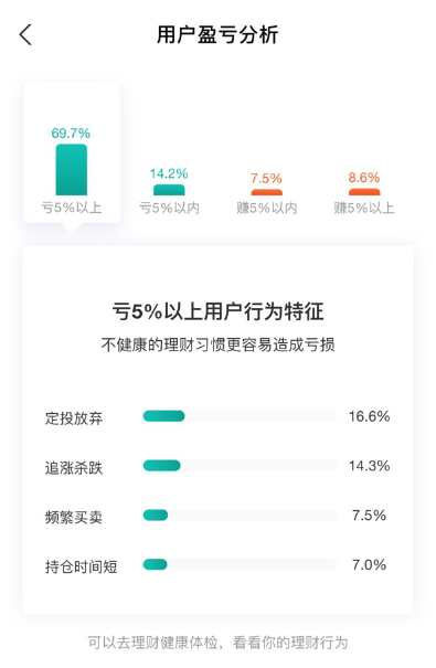 那么,买基金赚钱的用户又有怎样的特征呢?这些用户非但在上述致损因素上有一定“免疫力”,部分人还会坚持稳定的定投,或是有目标地进行止盈操作。