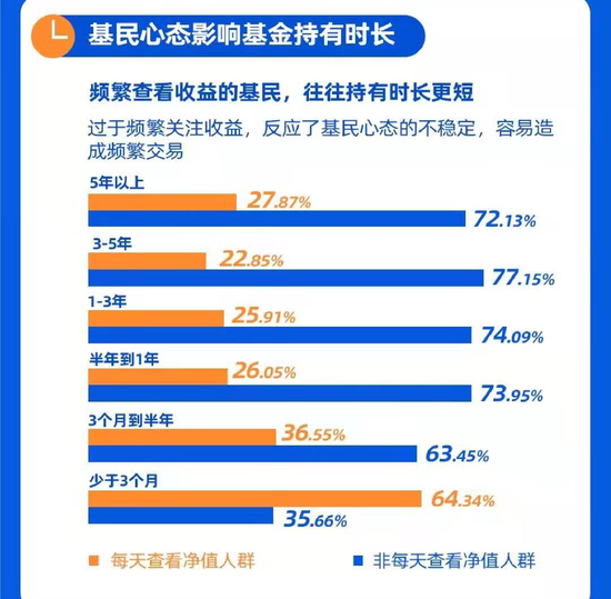 报告的研究还发现,频繁查看收益的基民往往持有时长更短。频繁关注收益反映了基民心态的不稳定,也容易造成频繁交易。其中持有基金在5年以上的投资者,仅不到3成每天查看净值,而持有时间少于3个月的投资者,超6成天天查看净值。