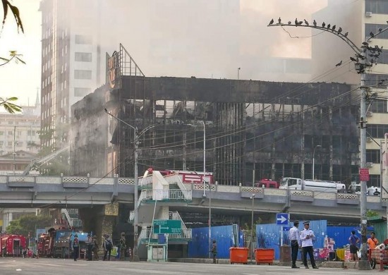 当地时间4月1日2时许,缅甸仰光两家商场先后发生火灾。虽然消防人员尽力扑救,但是两栋建筑已基本被烧毁。天亮之后余火仍未完全被扑灭。