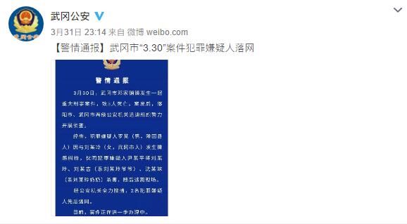 荔枝新闻讯 湖南省武冈市公安局官方微博3月31日晚发布警情通报,武冈发生重大刑事案件致3人死亡。