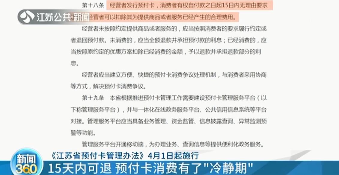 《江苏省预付卡管理办法》将施行后,像周先生这样的消费纠纷处理将有法可依。办法第十八条明确:经营者发行预付卡,消费者有权自付款之日起15日内无理由要求退款,经营者可以扣除其为提供商品或者服务已经产生的合理费用。《管理办法》一共37条,内容包括明确预付卡发行实行备案管理,对发行规模、单张限额、预收资金余额处理等作出规定。实行担保和资金存管制度。对依法被列入经营异常名录、被列为失信被执行人等经营者,禁止发行预付卡。规定经营者不得设定不公平、不合理的交易条件,不得强制交易,不得无偿占用预收资金余额等。法学界专家认为,从消费者保护角度看,办法有很多创新之处。