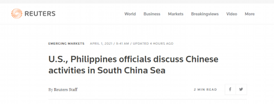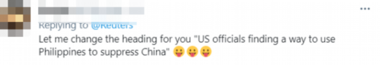 有网友在路透社相关报道下留言称,“我给你们(路透社报道)改一下标题,‘美国官员想方设法利用菲律宾压制中国’。”