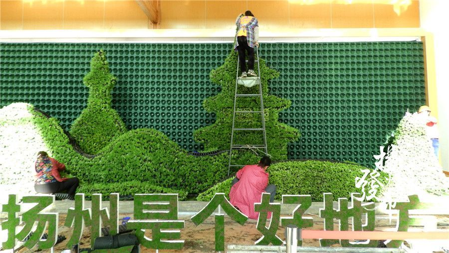 走进馆内大厅,电视背景墙上正播放扬州宣传片。大厅西侧,建有巨型绿雕“扬州是个好地方”。绿雕呈长方形,长20多米,高5米左右,展示扬州多处地标建筑:最中间是五亭桥,左侧有栖灵塔,右侧是白塔和文昌阁。背景墙上有“2021年扬州世界园艺博览会”的文字和扬州世园会的标志。