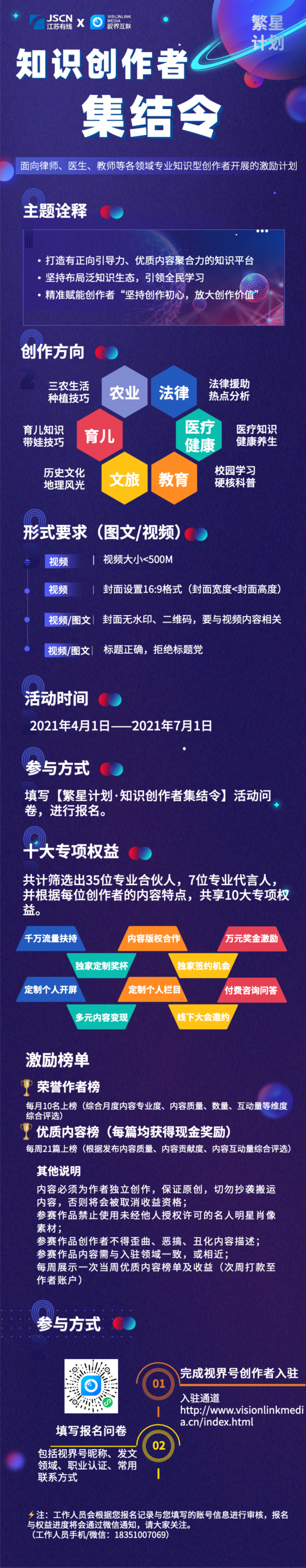 【视界观】作为江苏有线旗下的视频社交媒体“小屏”客户端,是公司重点打造的长三角创新媒体生态平台。本次启动「繁星计划·知识创作者集合令」计划,旨在精准赋能泛知识内容创作者“坚持创作初心,放大创作价值”,诚挚邀请各知识内容领域的专家学者、领军人物和知识创作机构共同打造具有特色品质的权威性知识共享平台。