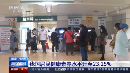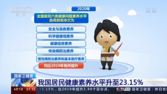 国家卫健委今天发布的监测结果显示,2020年我国居民健康素养水平达到23.15%,比2019年提升3.98个百分点,增长幅度为历年最大。