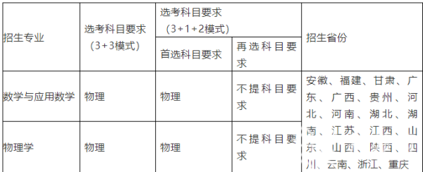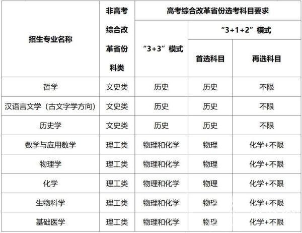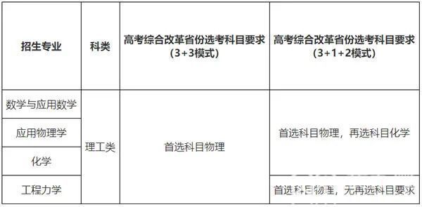 招生专业:数学类、物理学类、生物技术、哲学、核工程与核技术、工程力学。在非高考综合改革省份,哲学专业招收文科生,其他专业招收理科生。对实行高考综合改革省份的考生,选考科目须满足以下要求: