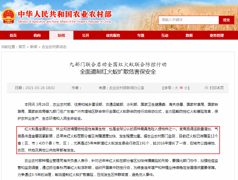 攻击性强和叮咬毒性大是红火蚁的主要特点,红火蚁毒液中的毒蛋白不仅会让容易过敏的人出现脸红、荨麻疹、呼吸困难等症状,重症患者可能在几分钟内产生休克,甚至出现死亡。