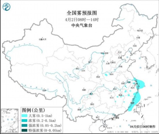 全国雾区预报图(4月2日08时-2日14时)