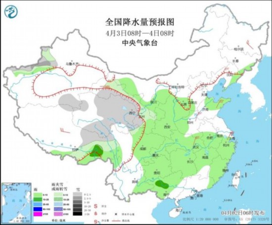 全国降水量预报图(4月2日08时-3日08时)