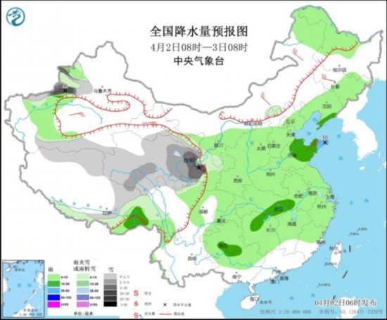 4月2日8时至3日8时,新疆伊犁河谷、西北地区中部等地部分地区有小雪或雨夹雪,其中,新疆伊犁河谷、青海东部和南部、甘肃中南部等地部分地区有中到大雪,局地暴雪(10~18毫米)。内蒙古河套地区和东北部、东北地区东部和西北部、新疆南疆盆地、西藏东南部、西北地区东部、华北大部、黄淮、江淮、江汉、江南大部、西南地区东部和北部、华南北部等地部分地区有小到中雨,其中,山东半岛等地部分地区有大雨(25~40毫米)。内蒙古中部和东部、东北地区西部、新疆南疆盆地、甘肃河西走廊西部、山东半岛等地部分地区有4~6级风。