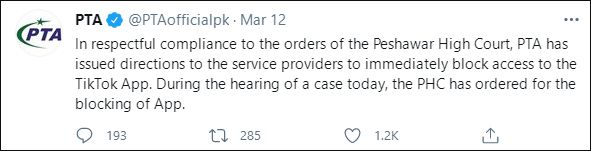 3月12日,巴基斯坦电信管理局官方推特发布了TikTok被封禁的消息