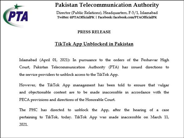 4月1日,巴基斯坦电信管理局(PTA)发布新闻稿称,根据白沙瓦高等法院的命令,巴基斯坦电信管理局已发布指令,以解除对TikTok的访问禁令。同时,TikTok的管理部门也已被告知,根据巴基斯坦《电子犯罪预防法》(PECA)的规定及法院的指示,需确保低俗(vulgar)及令人反感的(objectionable)内容无法被访问。今天,在与TikTok有关案件的听证会结束之后,白沙瓦高等法院依照指示解除了对该应用的封锁。