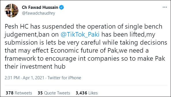 白沙瓦高等法院首席大法官拉希德·汗在4月1日解除封禁的听证会上表示:“当人们意识到巴基斯坦电信管理局将对他们采取行动时,他们将不再上传这类视频。”