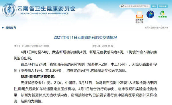 荔枝新闻讯 4月1日0时至24时,云南省新增确诊病例4例,新增无症状感染者4例。1例境外输入确诊病例治愈出院。