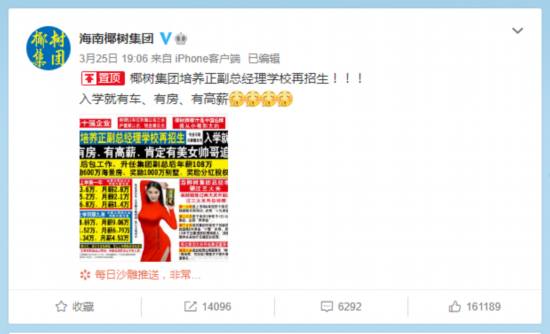 椰树集团官方微博3月25日发布的内容显示,“椰树集团培养正副总经理学校再招生,入学就有车、有房、有高薪,肯定有美女帅哥追。”据该广告,本次招生,专业不限,只要懂写作。毕业后包工作,升任集团副总后年薪108万,有贡献奖励600万海景房、奖励1000万别墅、奖励分红股权。